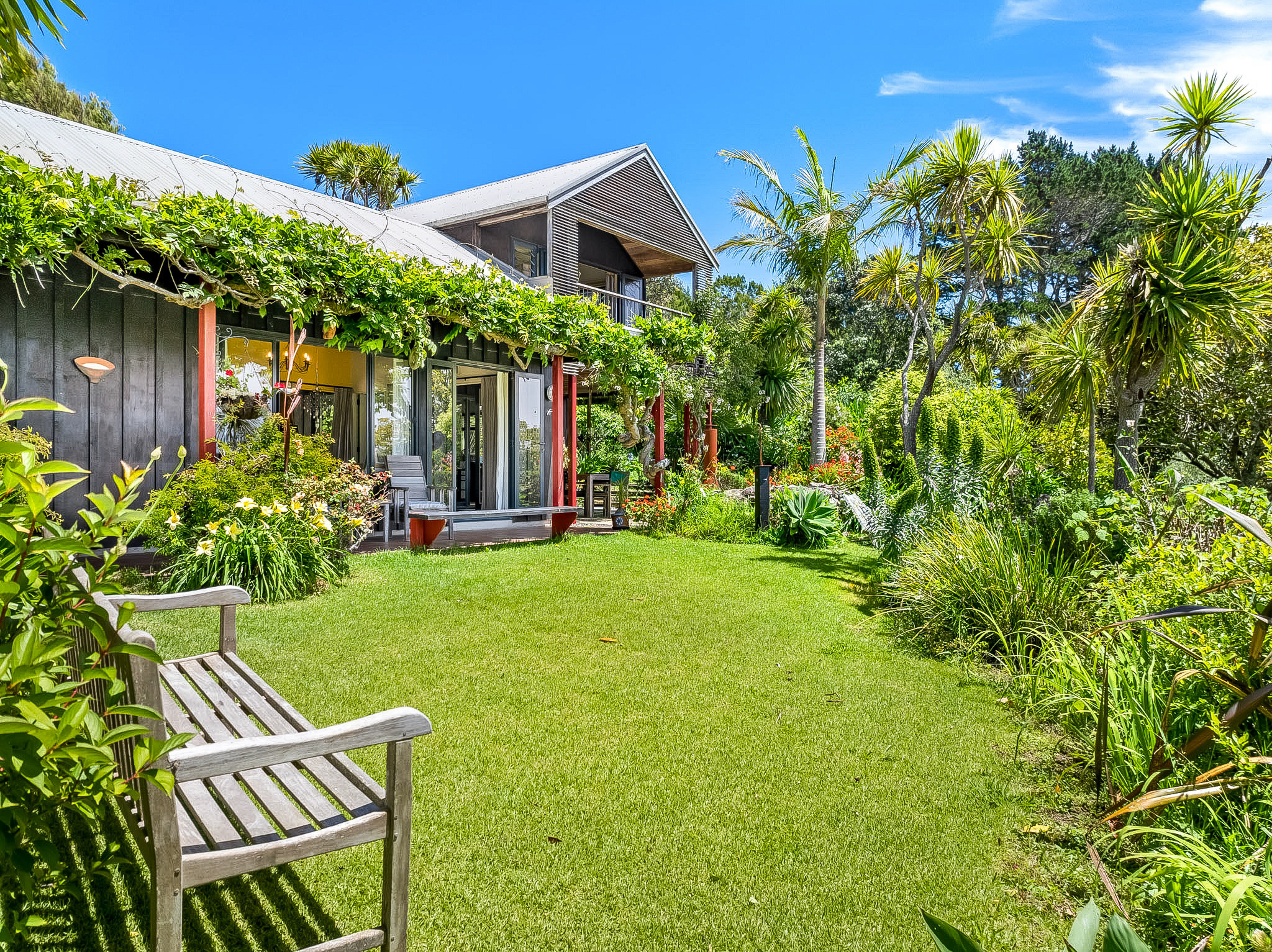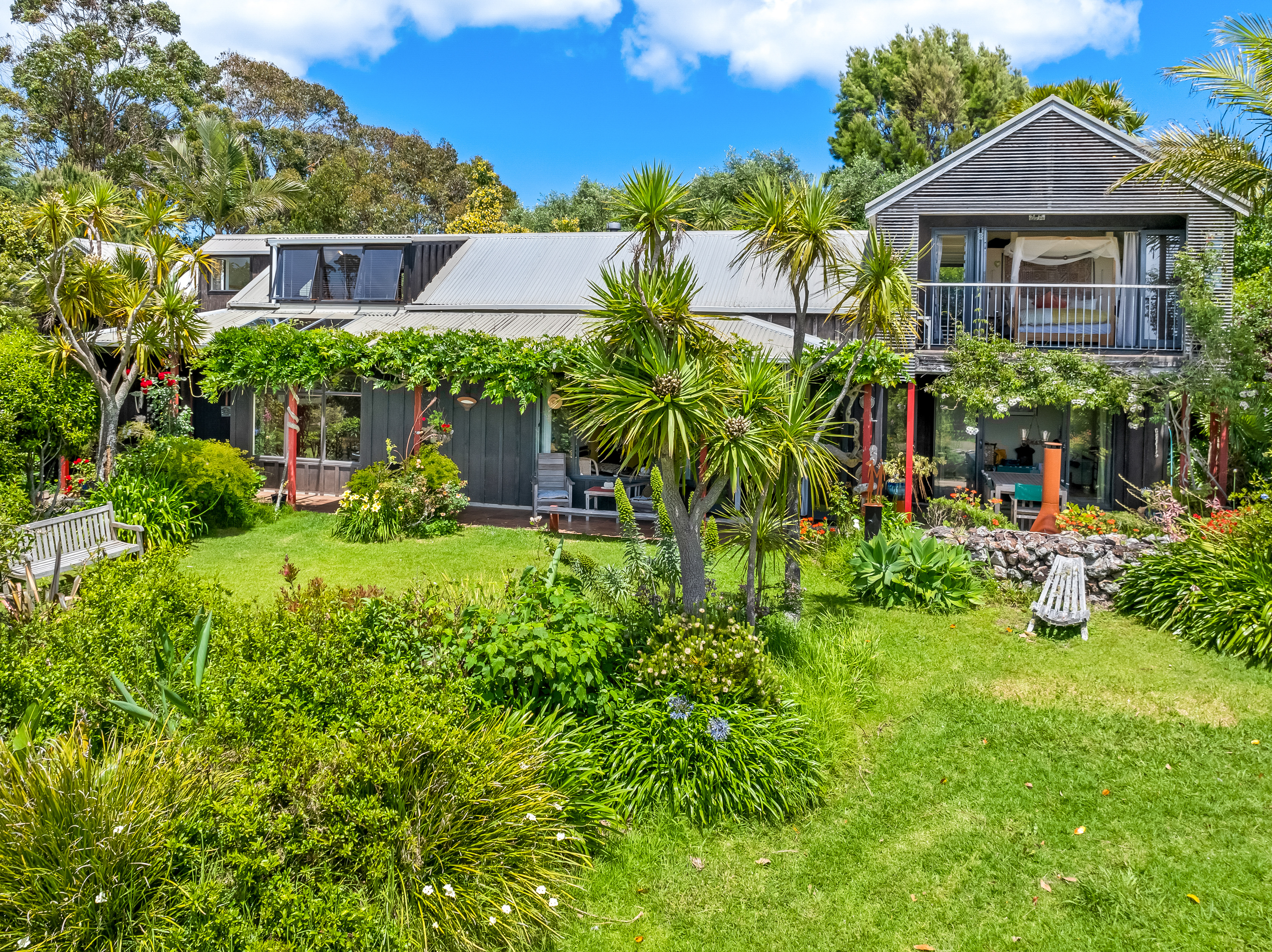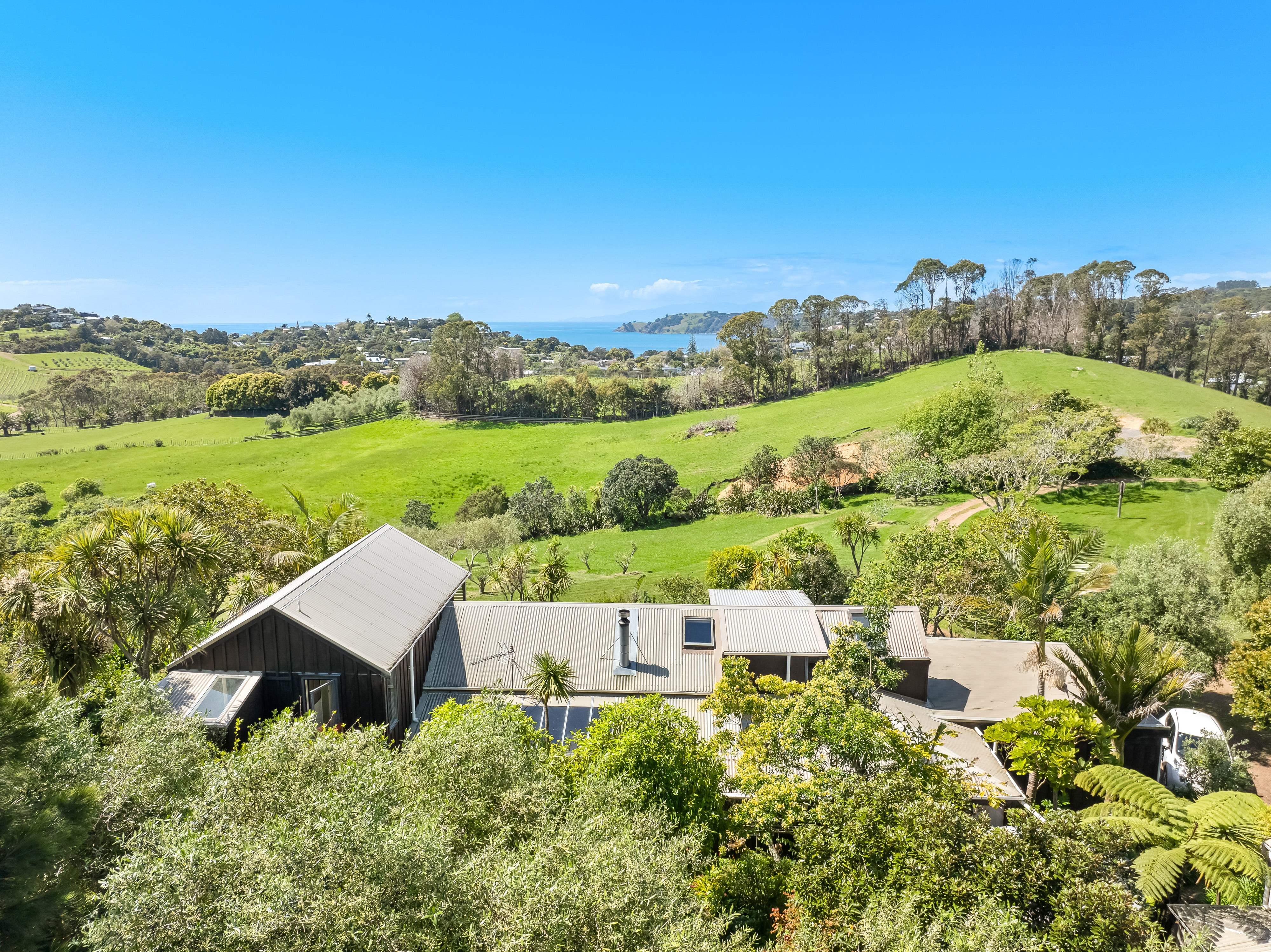 Elevated and private, the main residence rests gently among established gardens and open sky. Inside, two bedrooms and multiple living areas offer both connection and retreat. The modern kitchen links to a sheltered courtyard and generous dining area, while a separate lounge flows to a covered verandah and all-weather alfresco terrace. Upstairs, the main bedroom - with ensuite and walk-in wardrobe - enjoys expansive views over the olive grove and vineyards to Onetangi Bay and the outer Hauraki Gulf. A second staircase leads to a guest bedroom with an equally captivating outlook. A study and an internal-access double garage with workshop, complete the picture.