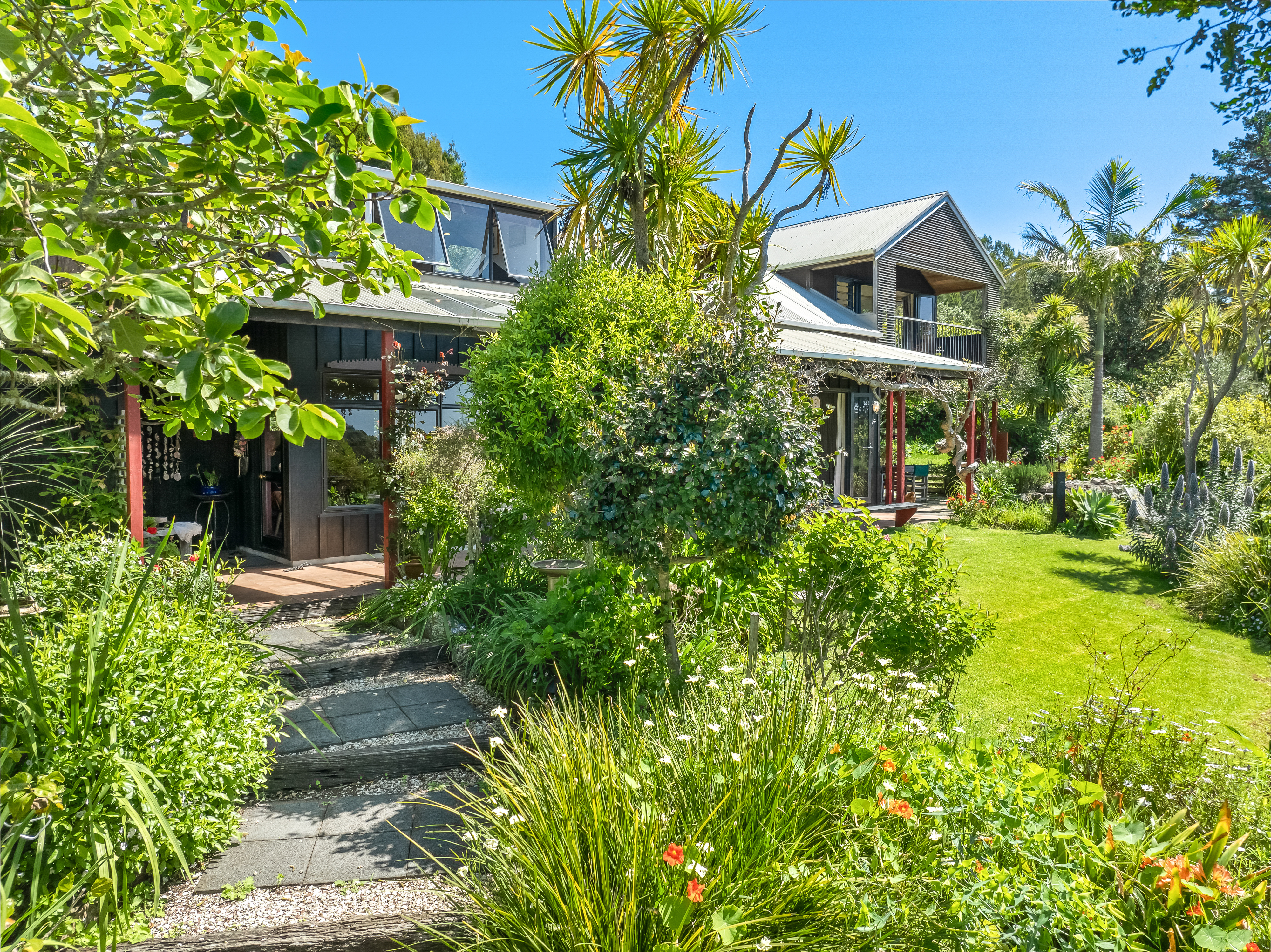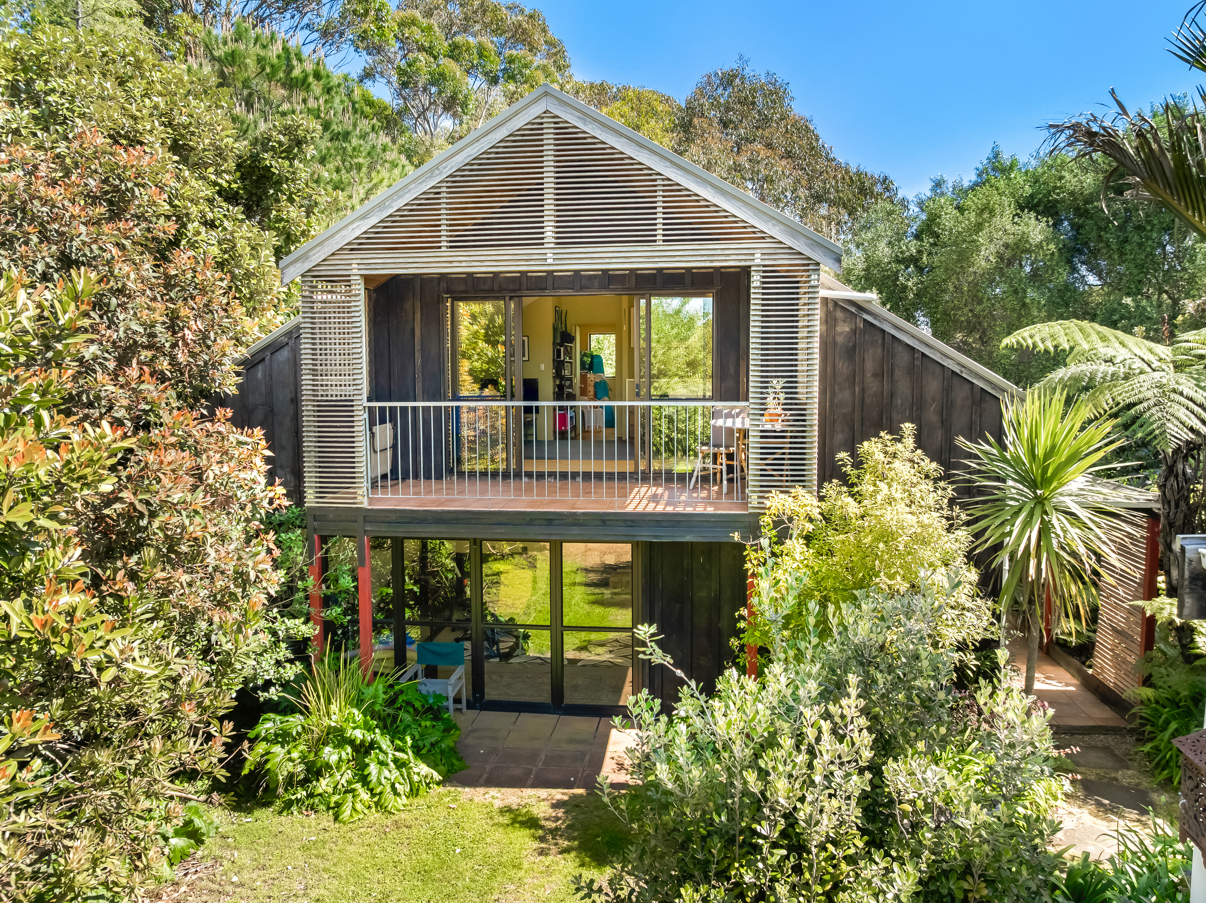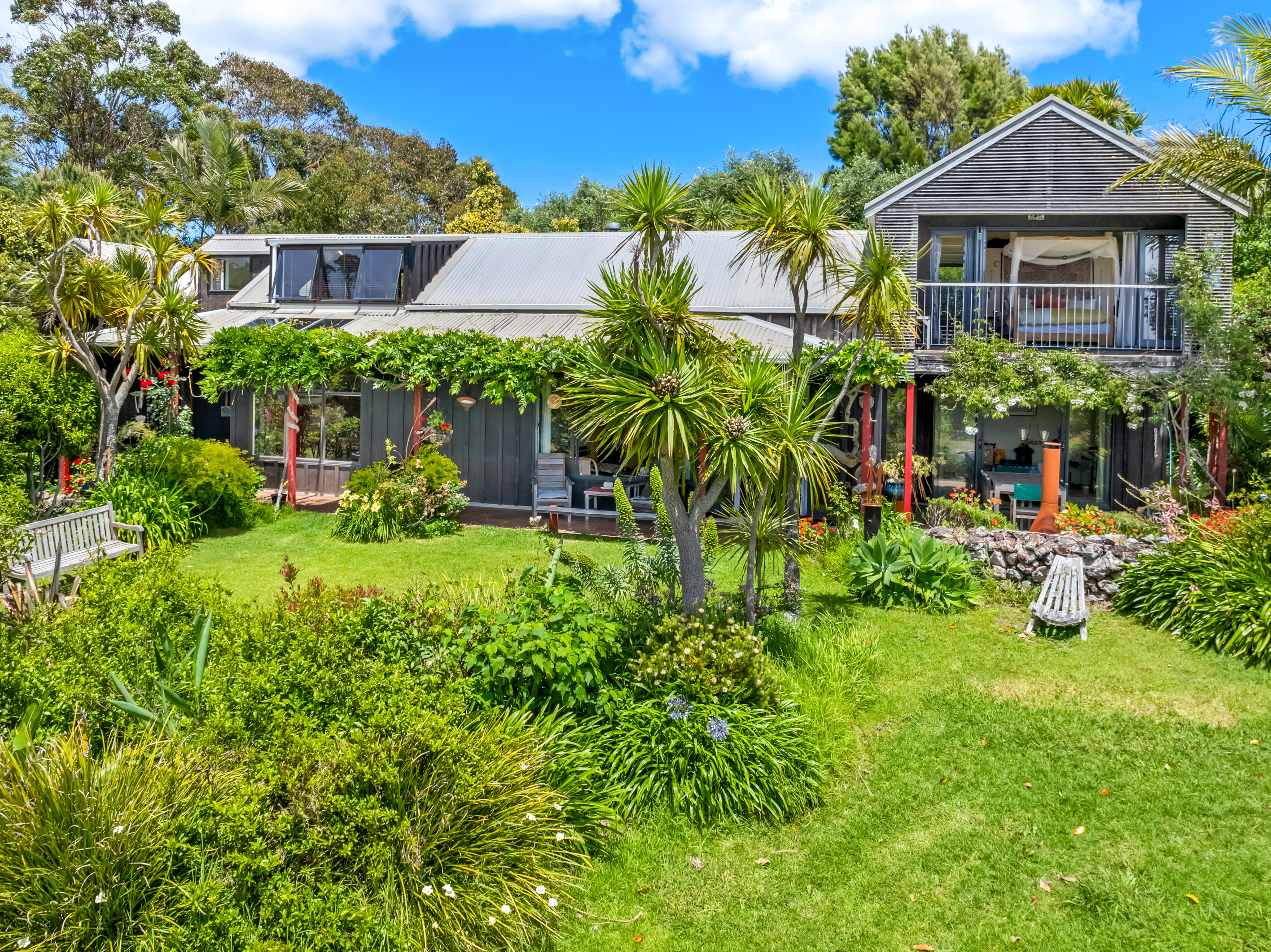 Elevated and private, the main residence rests gently among established gardens and open sky. Inside, two bedrooms and multiple living areas offer both connection and retreat. The modern kitchen links to a sheltered courtyard and generous dining area, while a separate lounge flows to a covered verandah and all-weather alfresco terrace. Upstairs, the main bedroom - with ensuite and walk-in wardrobe - enjoys expansive views over the olive grove and vineyards to Onetangi Bay and the outer Hauraki Gulf. A second staircase leads to a guest bedroom with an equally captivating outlook. A study and an internal-access double garage with workshop, complete the picture.