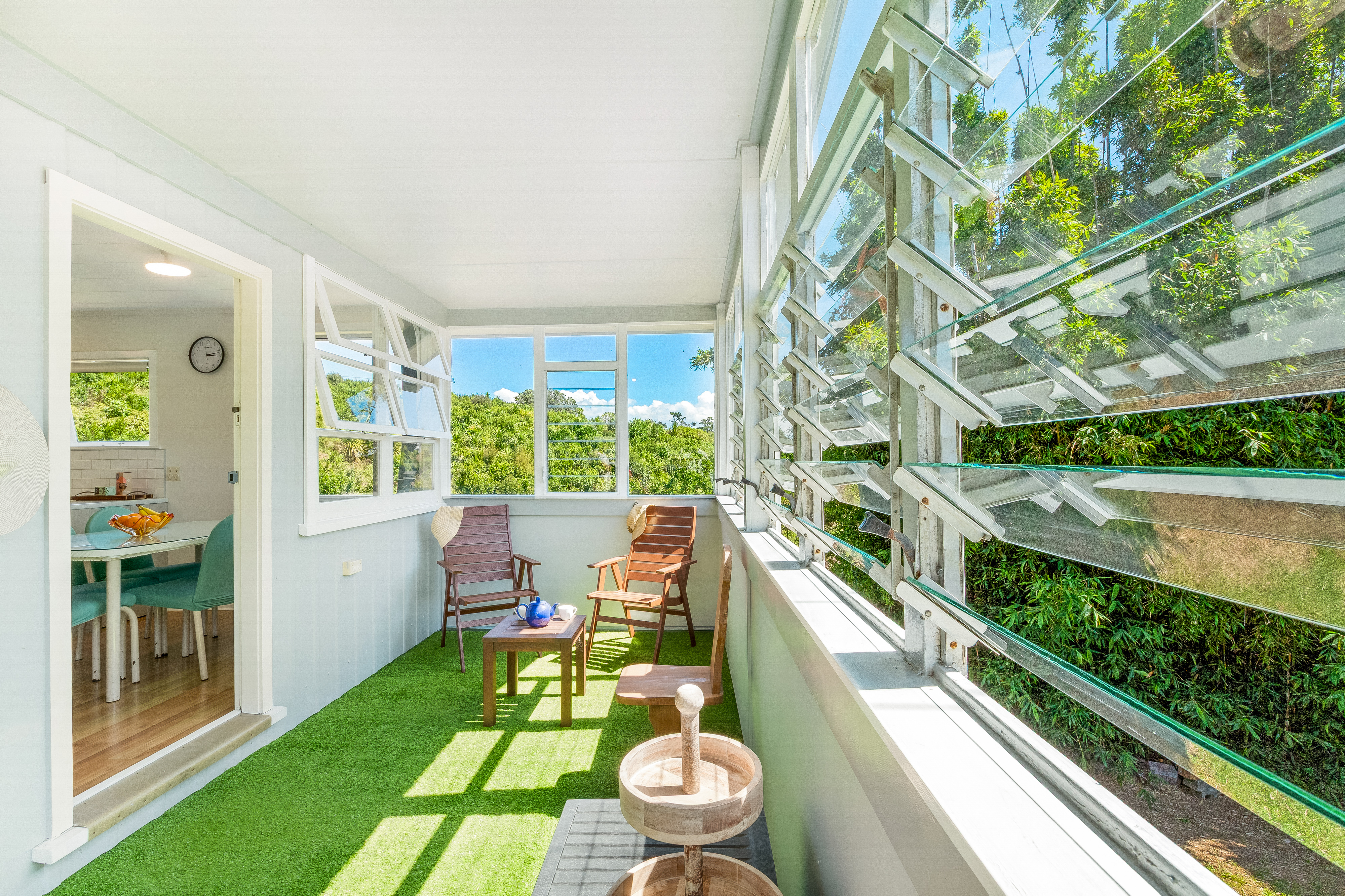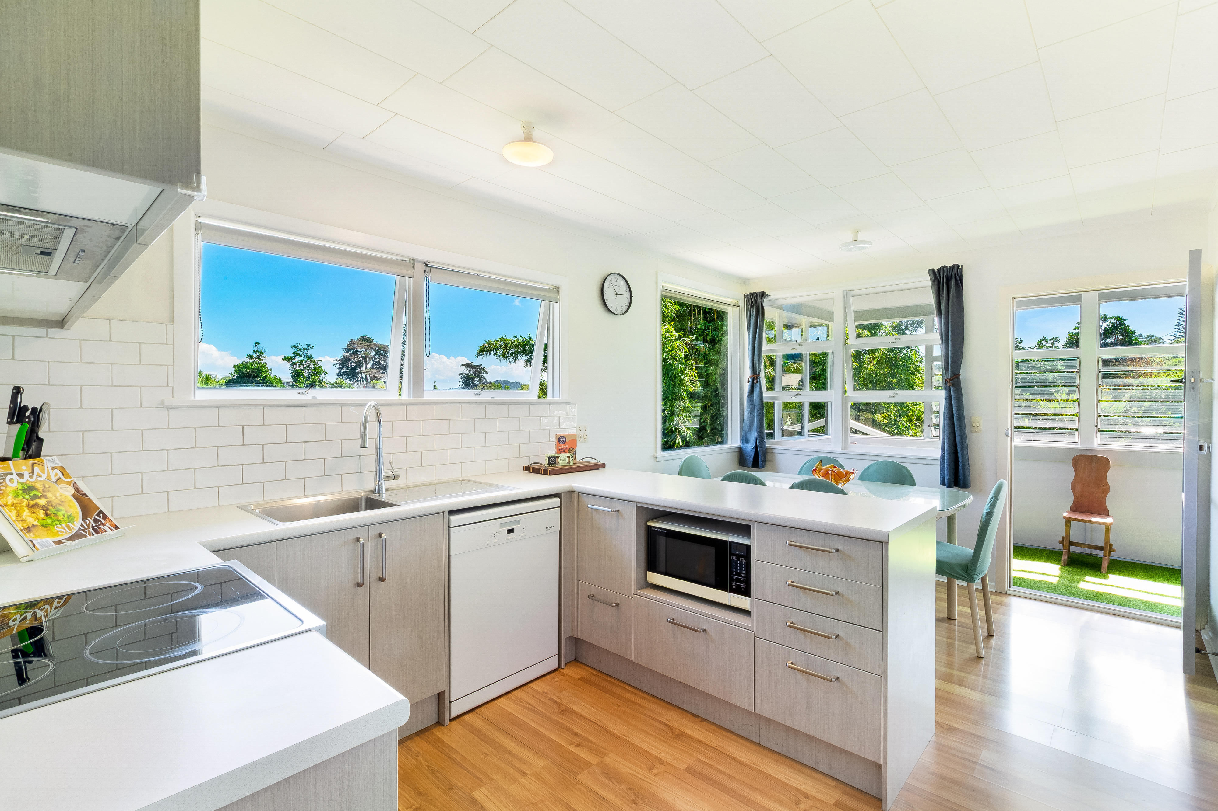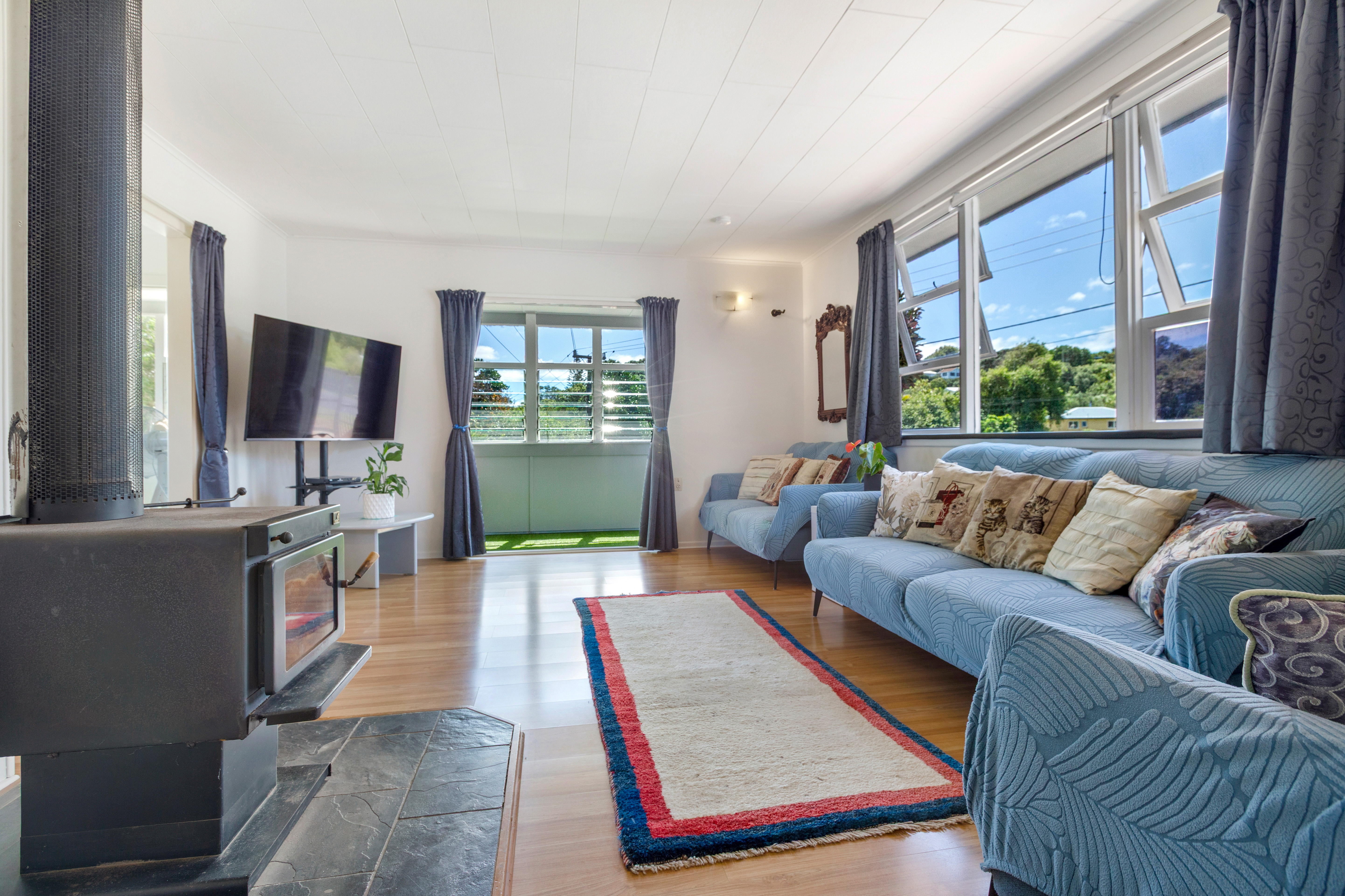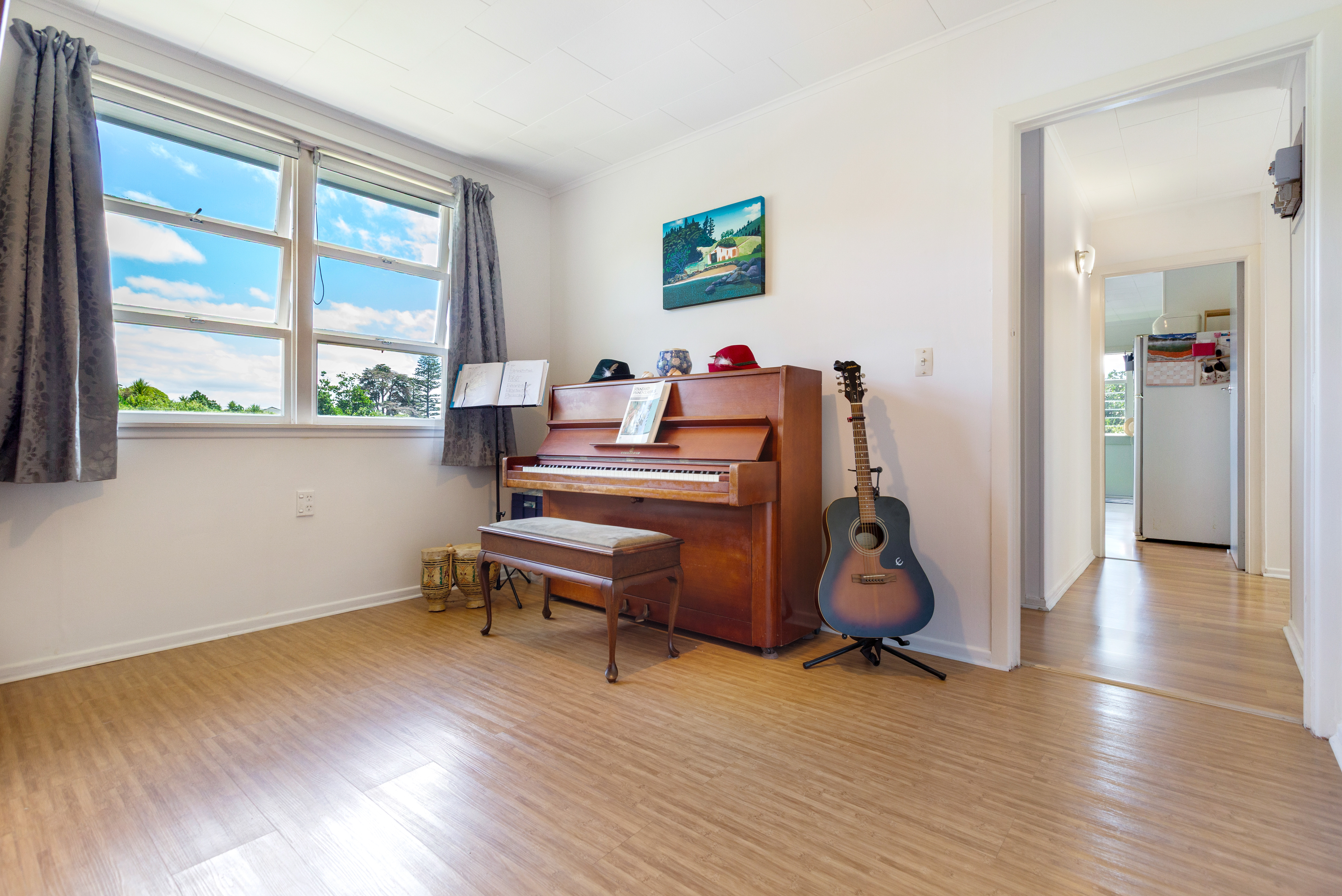 An updated kitchen with modern fixtures and tiled splashback, connects directly to the dining area and sunroom, creating a gentle flow through the centre of the home. The lounge is generous and offers both a heat pump and a wood burner. French doors open onto the sunroom, a space that catches the shifting light of day. A separate library or music room sits just off the kitchen, while laundry facilities and extensive dry storage are located beneath the house.
