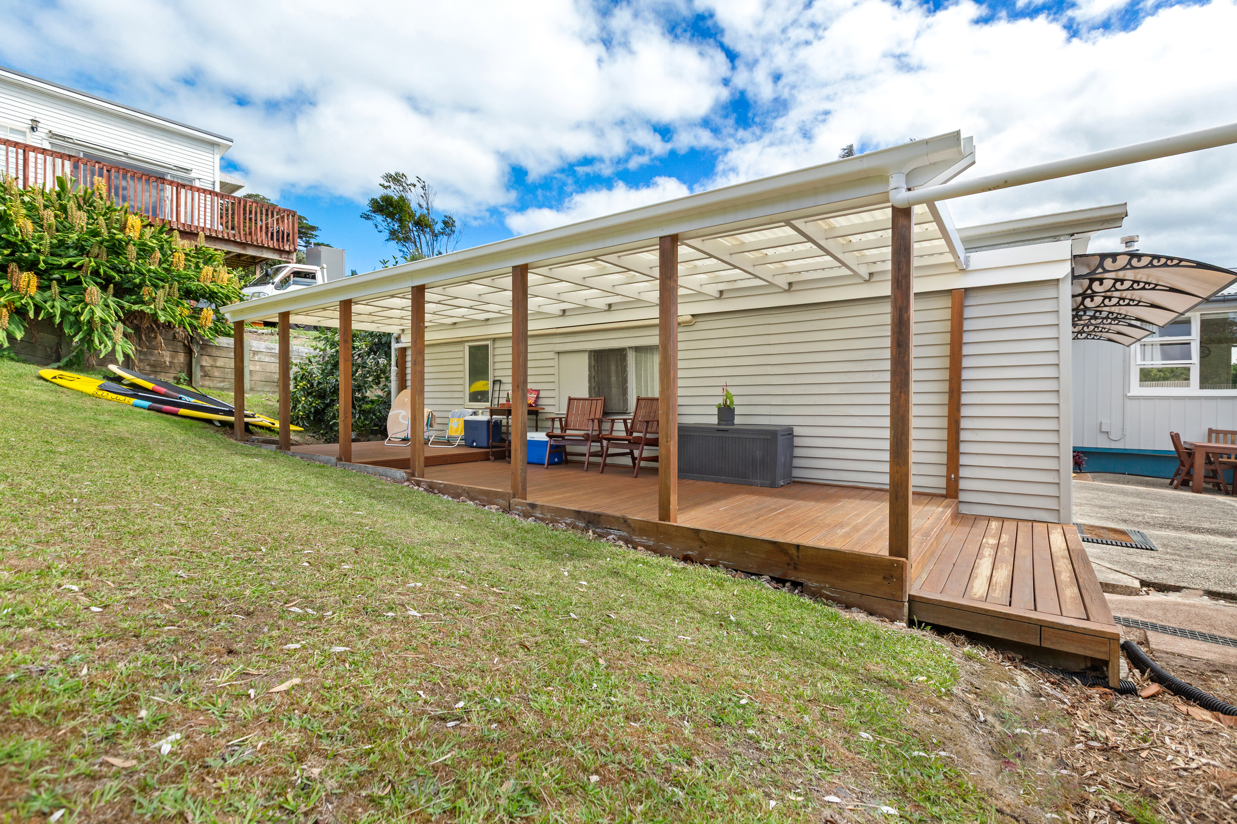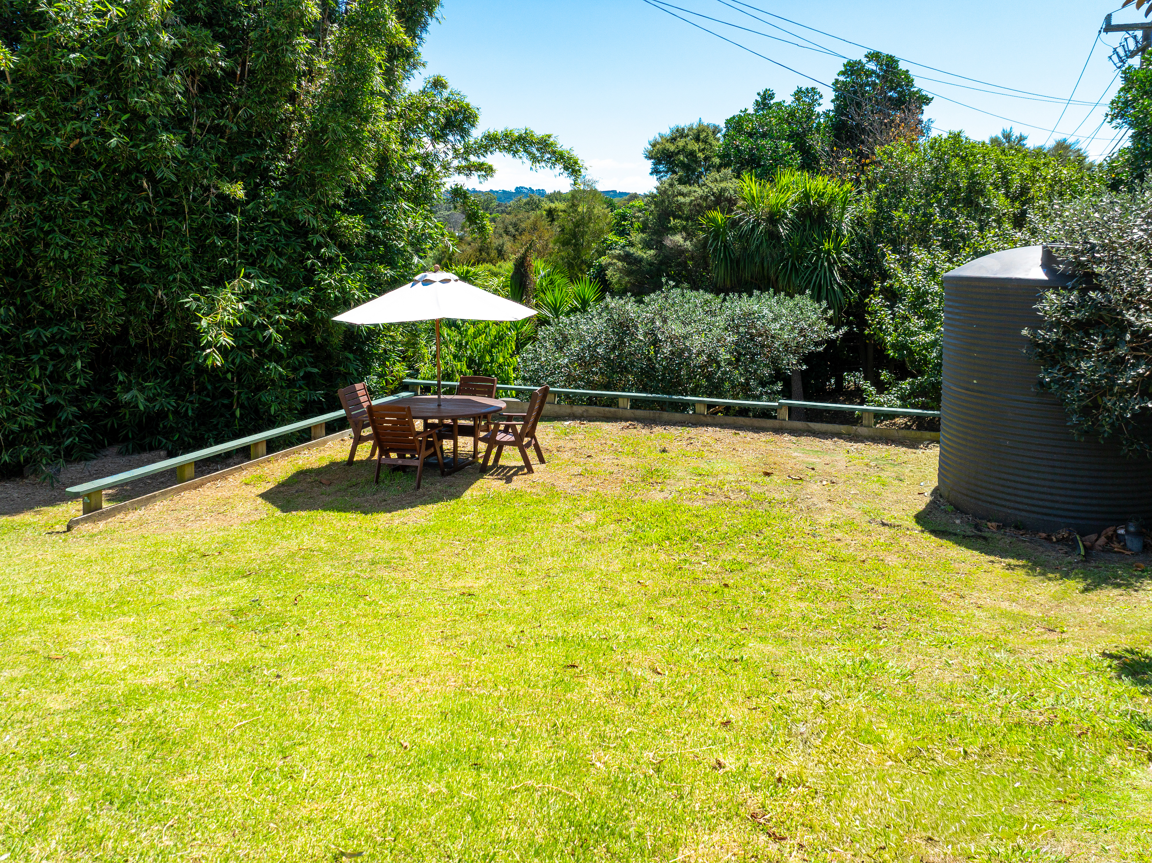 Outside, the land slopes gently and is mostly fenced, with fruit trees, raised vegetable beds, and a freestanding shed. Gated rear access leads to the Hooks Lane bridle path for an off-road route to the kindergarten, high school, and Surfdale Beach.