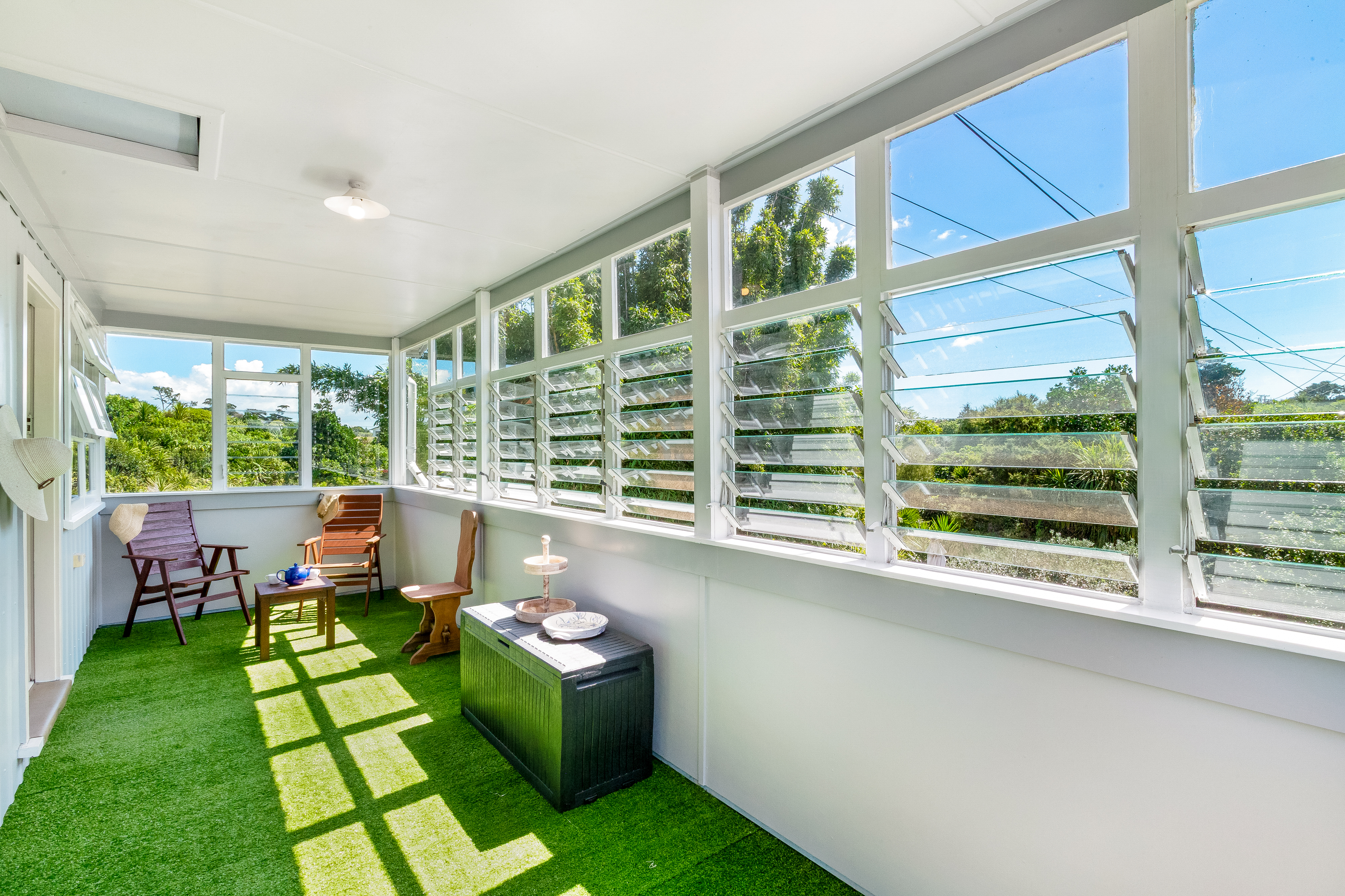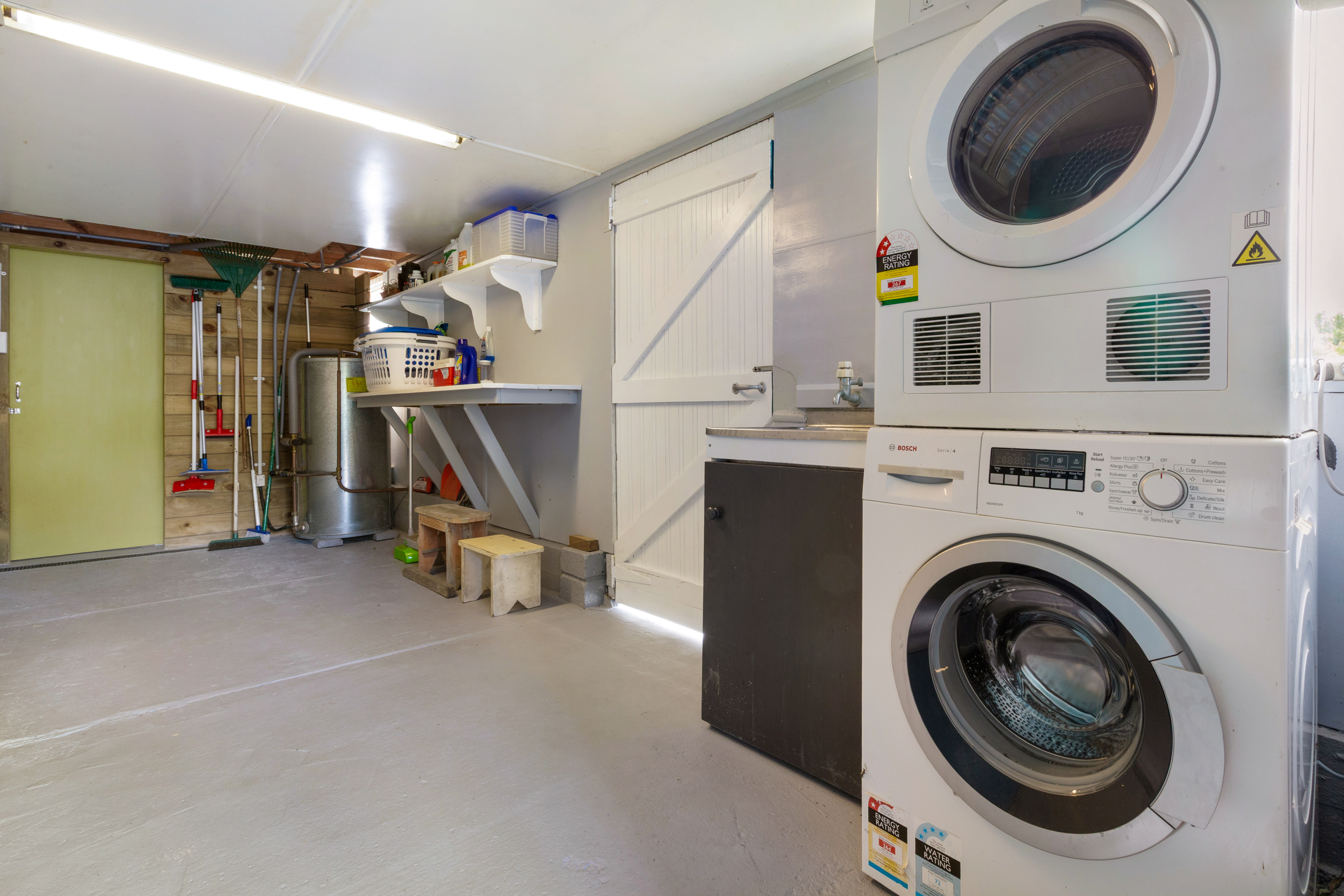 Work, play and creativity are accommodated in a four-car garage that has been reconfigured into separate rooms, three fitted with heat pumps and linked to a covered east-facing deck.